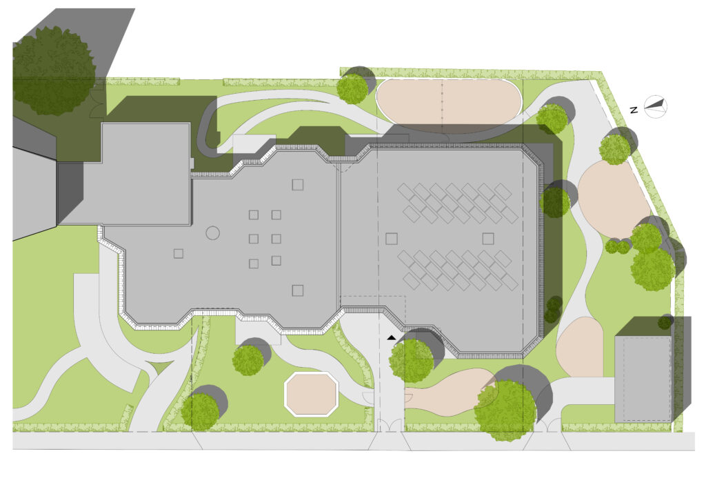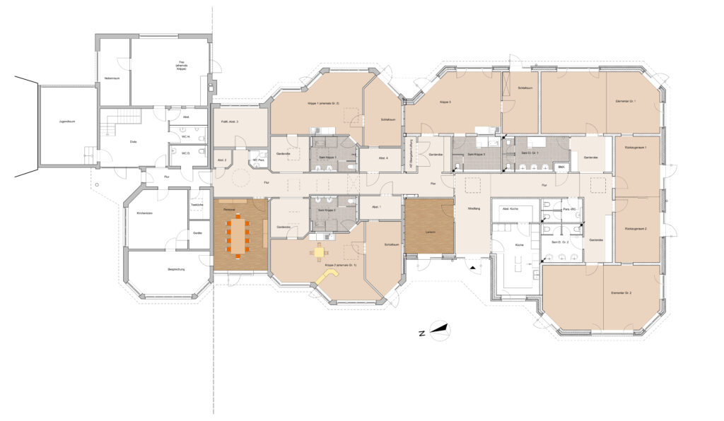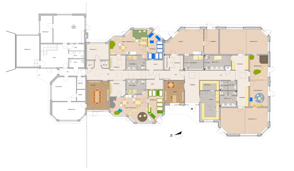 Durch das umgesetzte Raumprogramm wurden Defizite des alten Grundrisses behoben: jedem Gruppenraum ist nun ein eigener Sanitärbereich zugeordnet, jedem Krippenraum ein separater Schlafraum. Zudem wurden zwei zusätzliche Rückzugsräume für gruppenübergreifende Arbeit sowie neue Mitarbeiterzimmer mit Sanitärbereich und eine geräumige Ausgabeküche geschaffen. Der zentrale Hauptzugang und die gruppenweise Anordnung von Krippen- und Elementarbereich ermöglichen eine ungestörte Nutzung. Auch die Außenanlagen wurden komplett neu gestaltet.