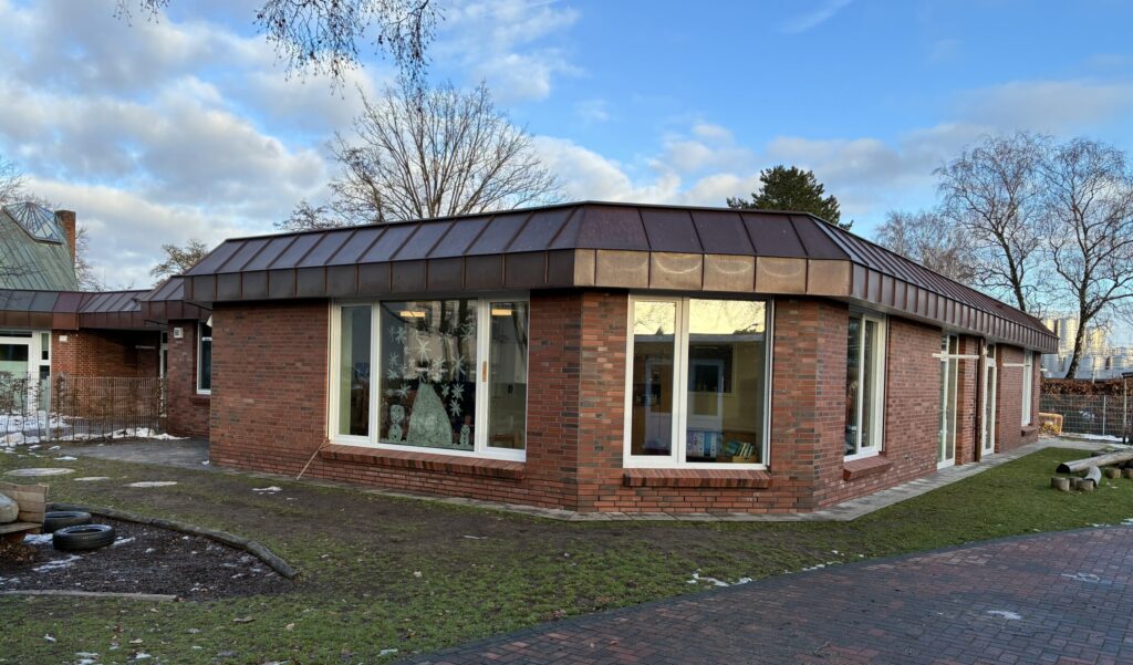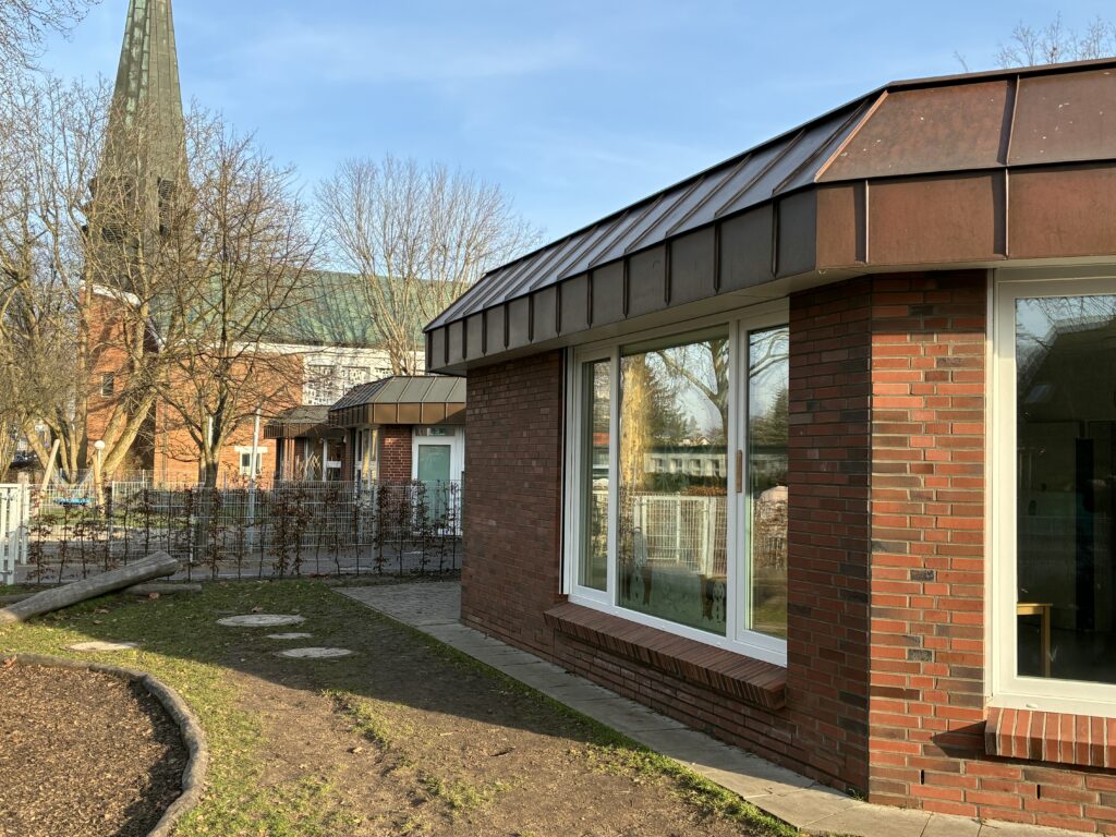 Die Kindertagesstätte der Erlöserkirche in Uetersen, die bisher drei Krippen- und Elementargruppen beherbergte, wurde durch einen Anbau erweitert, um die Kapazität auf fünf Gruppen zu erhöhen. Zusätzlich wurde der Kindergarten neu geordnet und zu einer funktionalen Einheit zusammengeführt, wobei freigewordene Raumkapazitäten aus dem Gemeindehaus wieder der Kirchengemeindearbeit zugeführt wurden.
